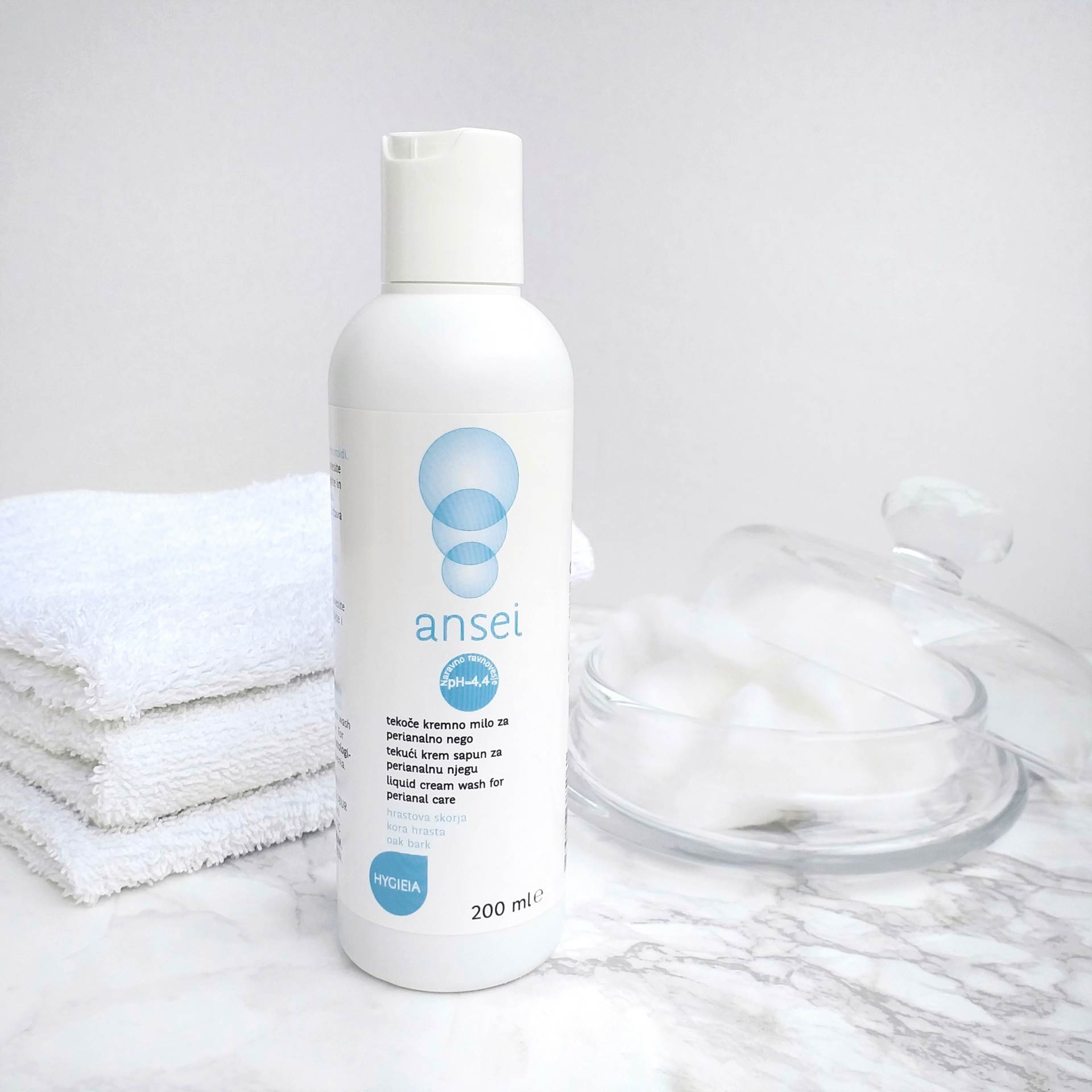 Ansei Hygieia tekući je kremasti sapun koji olakšava svakodnevnu higijenu perianalnog područja kod hemoroida, posebno kod ljudi koji imaju problema pri defekaciji. Načinjen posebnim sastojcima, reguliranom kiselošću pH (4,4) te uz dodatak tinkture kore hrasta antiupalnog djelovanja, ovaj tekući sapun smanjuje nelagodu. Ne isušuje sluznicu i kožu, osigurava pravilnu higijenu osjetljivog područja i ublažava simptome kao što su iritacija i svrbež.