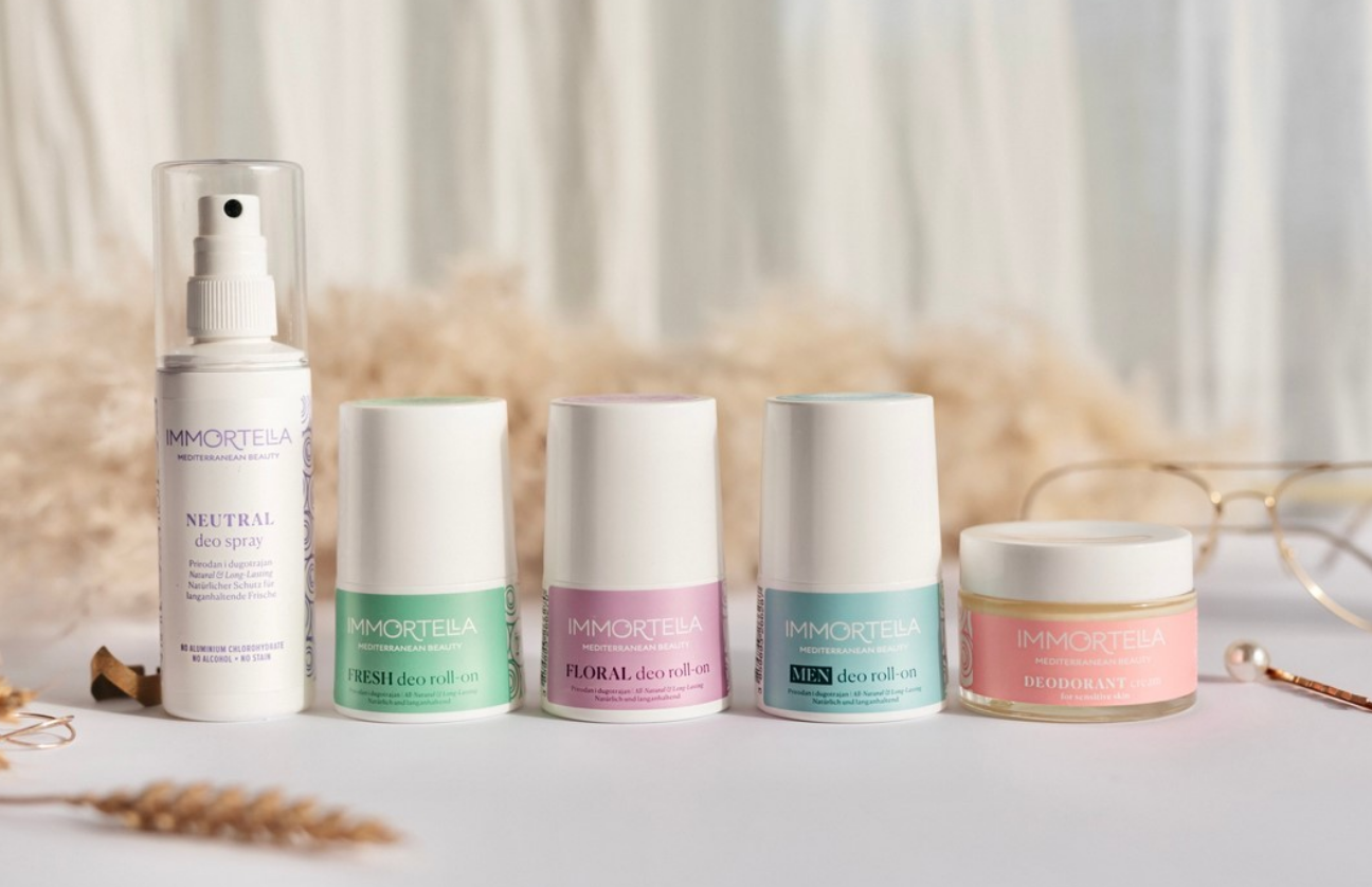Immortella prirodna kozmetika za ovo je proljeće pripremila novu kolekciju izvrsnih, prirodnih dezodoransa. Deo roll-oni formulirani su bez aluminija, sode bikarbone i alkohola, a osvježavajući mirisi: Floral – cvjetni miris eteričnih ulja lavande i ylang-ylanga; Fresh – osvježavajući miris eteričnih ulja eukaliptusa, limuna i kadulje; i Men – moćan miris eteričnog ulja sandala i limuna; bazirani su na visokokvalitetnim eteričnim uljima čije komponente tvore neodoljive, nenametljive mirise te osiguravaju dugotrajnu svježinu. Deo roll-oni, povrh toga, ne ostavljaju mokar, ljepljiv trag na koži već naprotiv, ugodno njeguju te pouzdano štite od razvoja loših bakterija.