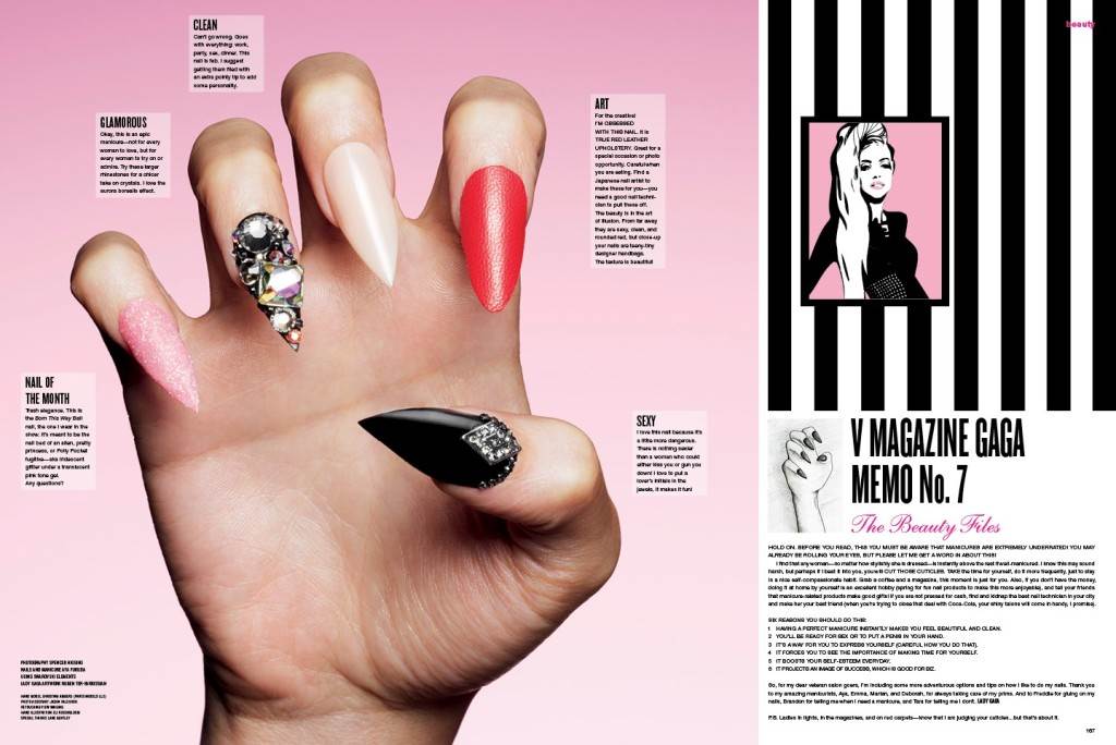 Vjerojatno najzaslužnija osoba za povratak velikih, iznimno ukrašenih noktiju jest "Mother Monster", famozna američka pop ikona Lady Gaga koja je u svega par godina osvojila svijet upečatljivom pojavom. Ubrzo su sve ostale kolegice iz branše, uključujući Rihannu, Ritu Oru i Adele, počele odlaziti na manikure te se time pojavio nezaobilazan trend. U sklopu časopisa V, Lady Gaga odlučila je predstaviti svoje najdraže manikure koje uključuju - kožu, cirkone, jake boje i još štošta toga neobjašnjivog laičkom oku. Biste li i vi eksperimentirali s noktima poput Lady Gage i Rihanne? Fotografije: V