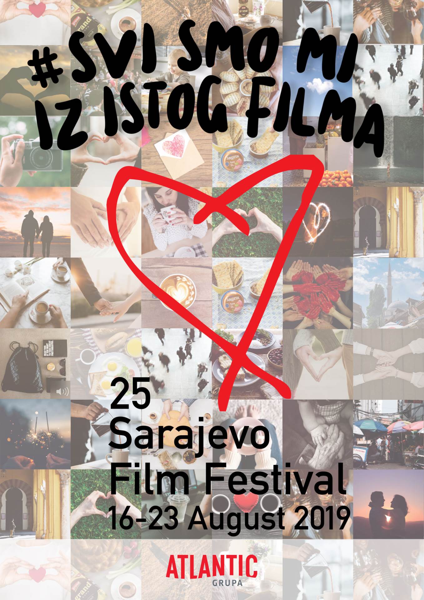 Sarajevu prošle godine i čija je ideja bila povezati svakodnevne umjetničke trenutke i emociju ljudi diljem regije u jednu posebnu priču. Ove godine pod istom porukom #SviSmoMiIzIstogFilma, Atlantic Grupa i Sarajevo Film Festival omogućit će svima koji na svojim društvenim mrežama objave fotografiju sa simbolom srca, ili je pošalju putem obrasca na istoimenom webu, da postanu dijelom mozaika „Najveće Srce u Sarajevu“, koji će svečano biti otkriven u Sarajevu 18. kolovoza.