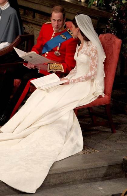 Vjenčanicu buduće princeze Kate dizajnirala je Sarah Burton, a zanimljivo je kako je upravo na Twiteru objavljeno da joj je ona dostavljena ni više ni manje nego podzemnom željeznicom. Mlada je u Westminstersku opatiju ušetala u pratnji oca u klasičnoj bijeloj strukiranoj vjenčanici, prozirnog čipkastog gornjeg dijela i rukava, s potpisom Alexandera McQueen. Na glavi je nosila tijaru posuđenu iz kraljevske riznice. Sudbonosno 'da' par je izrekao u 12.15 sati, a potom su razmijenili zavjete i prstenje.