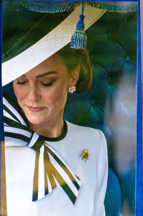 Princeza od Walesa nosila je zanimljiv broš tijekom prvog javnog izlaska nakon objave da boluje od raka. Kate Middleton pojavila se na paradi Trooping the Colour, a fotografi su zabilježili kako se razdragana podrškom okupljenog mnoštva smije u kočiji. S njom su bili princ George, princeza Charlotte i princ Louis. Nosila je haljinu Jenny Packham, uz fascinator s potpisom Philipa Treacyja.