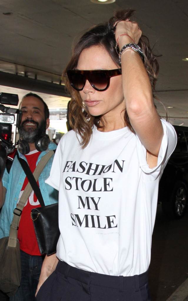 Bivša 'Spajsica', dizajnerica Victoria Beckham svojim je outfitom poslala zanimljivu poruku. Naime, snimljena je u u zračnoj luci LAX u Los Angelesu u crnim hlačama iz svoje kolekcije i bijeloj majici kratkih rukama s natpisom 'Fashion Stole My Smile' ('Moda mi je ukrala osmijeh'). Obzirom na to da slovi za javnu osobu koju se gotovo nikada ne smije, odnosno rijetko je u javnosti uopće i ovjekovječen njezin osmijeh, ovom se porukom našalila na svoj račun. 'Ja zapravo nisam takva, već ozbiljnim izrazom lica reagiram u određenim situacijama. Mislim da je to ok, to sam ja', kazala je za Elle.com.