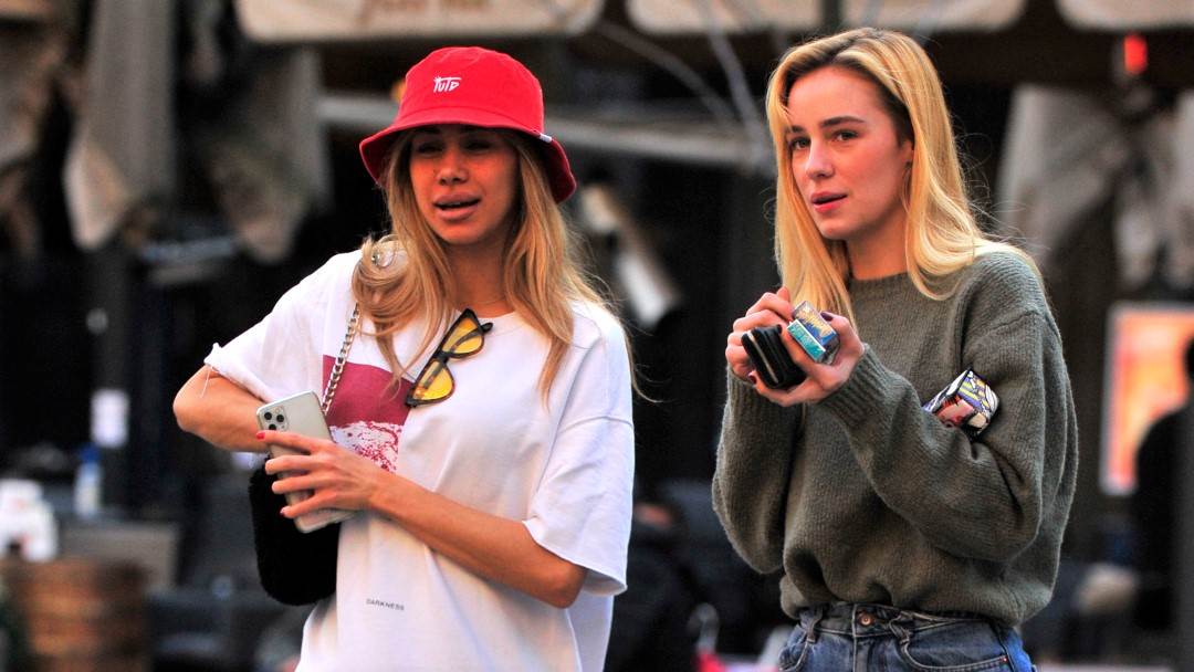 Druga plavuša (s desne strane) nosila je uske traperice sa širim nogavicama također retro ili Y2K stila, a kombinirala ih je s otvorenim cipelama na visoku petu i običnom majicom maslinasto zelene boje.