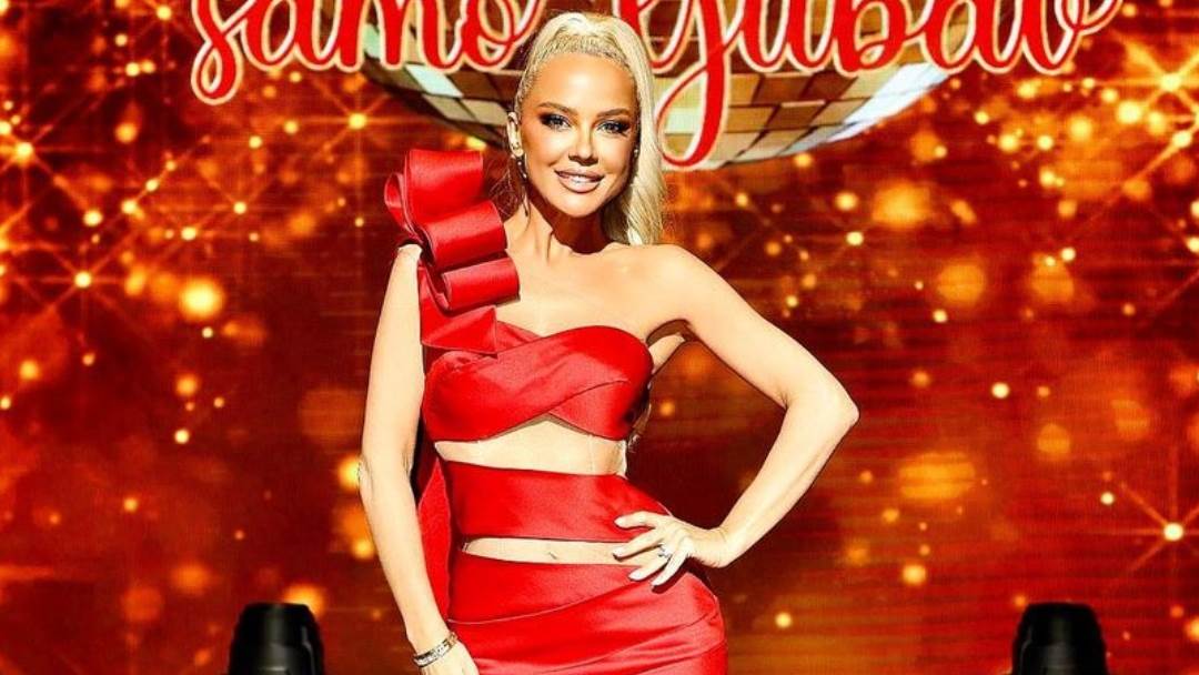Pjevačica, koja se odlično snalazi u voditeljskoj ulozi, ovog puta je odjenula crvenu, kratku haljinu koja je malo toga prepustila mašti. Kreacija s predimenzioniranom mašnom na desnom ramenu je istaknula Majinu savršenu liniju na kojoj radi u teretani.