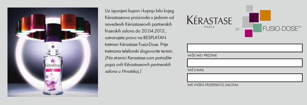 KERASTASE FUSIO-DOSE njega – priuštite kosi BESPLATAN i individualiziran tretman luksuznom njegom Kerasaste Fusio – Dose! Kerastaseov ekskluzivni salonski tretman Fusio-Dose predstavlja novu eru personalizirane njege kose.Riječ je o prvom njegujućem sustavu visokokoncentriranim, hi-tech aktivnim sastojcima koje frizer kombinira na licu mjesta i kreira individualiziranu njegu primjerenu vašem tipu kose, pretvarajući pritom svoj frizerski salon u laboratorij viskoke tehnologije. Tretman počinje dijagnosticiranjem stanja vlasi i vlasišta. Nakon ispitivanja suhoće, osjetljivosti boje i gustoće kose, frizer odabire jedan od četri koncentrata Fusio-Dose, jer nije svejedno je li vam kosa čvrsta ili slaba, normalna ili (jako) suha, a vlas debela, tanka ili se stanjuje. Na temelju primarnih i sekundarnih potreba kose, frizer kombinira omjer koncentrata Fusio-Dose i započinje vaš čarobni ritual preporoda kose!