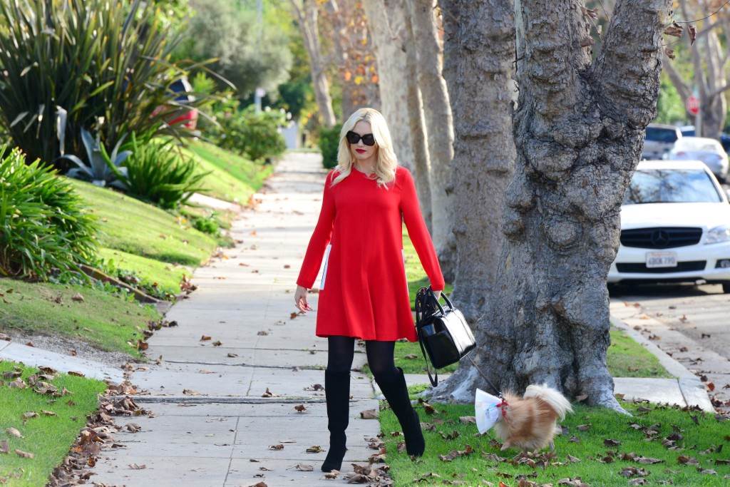 Uvijek dotjerana, s crvenim ružem i istom takvom haljinom, plavokosa pjevačica snimljena je ispred ulaza u roditeljski dom, a stylingom je ponovno uspjela prikriti trudnoću.