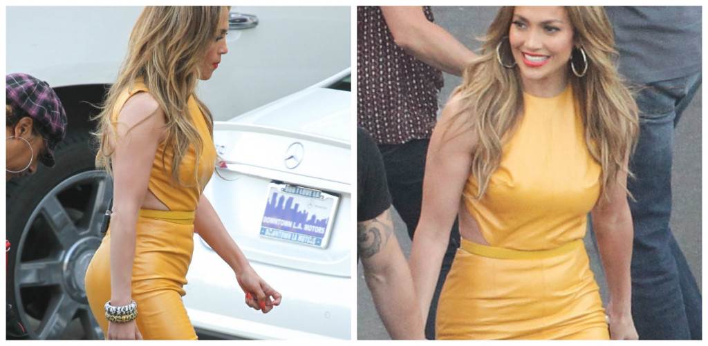Na snimanju live emisije 13. sezone Američkog Idola u Los Angelesu, pjevačica i glumica Jennifer Lopez zasjala je u kožnoj, pripijenoj haljini boje senfa Phillipa Armstronga. Haljina bez rukava, dužine do koljena, ima otvorena leđa i samo još više naglašava obline 44-godišnje Jennifer. Modni outfit nadopunila je Jimmy Choo platformama, glomaznim naušnicama te narančastim ružem za usne.