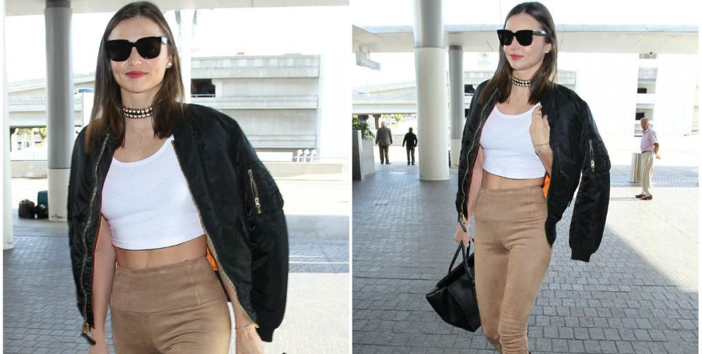 Ljepotica svjetskog glasa Miranda Kerr još je jednom pokazala da ima nevjerojatan smisao za modu i da se za njom svi okreću čak i kad se odjene za svakodnevnu šetnju u grad. Atraktivnu manekenku paparazzi su uhvatili u Los Angelesu, a nosila je razotkrivajući, kratki bijeli top i uske hlače visokog struka u boji devine dlake. Preko ramena je damski prebacila crnu bomber jaknicu s potpisom Saint Laurent. Cijeli izgled odlično su zaokružile crne gležnjače sa vrhom koji ide u špic, kao i velika crna kožna torba. Poseban začin ovom njezinom looku dali su i crna ogrlica sa metalik zlatnim detaljima te velike crne sunčane naočale.