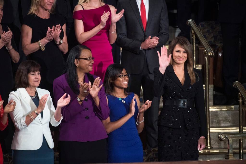 Melania se u loži pojavila u društvu rodbine ljudi koji su stradali u napadima neprijavljenih imigranata, s ciljem dodatnog ojačavanja Trumpove politike, točnije, direktivi o zabrani ulaska u SAD za građane sedam većinom muslimanskih zemalja.