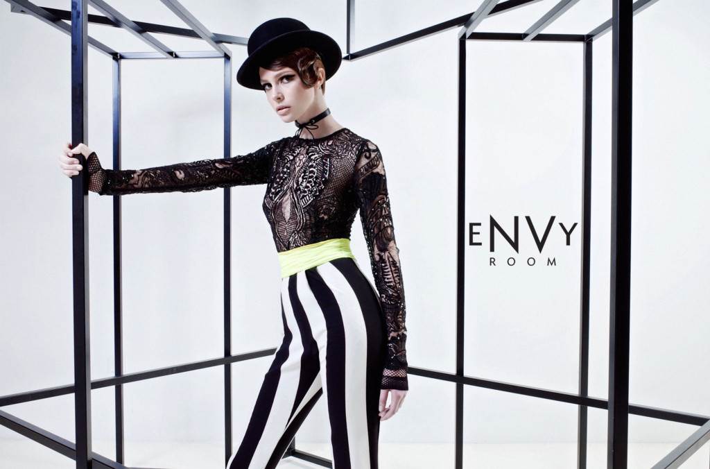 Slavna eNVy room crno bijela igra i ovoga puta nije izostala te je u novoj kolekciji osvježena dekonstrukcijom, kosim rezovima i dijagonalama. Monokromatski grafizam crno bijelih pruga efektno se spaja s delikatnom čipkom, a pomalo futurističku notu kolekciji daju haljine i suknje metaliziranog sjaja te pamučni Tshirti sa srebrnim printom. Tu su i popularni eNVy room kombinezoni, suknje zvonolikog i tulipan kroja, lagane pamučne košulje s volanima, hlače mrkva kroja, kimona od večernjih i dnevnih materijala te torbice izrađene od srebrene i crne lakirane kože koje su ove sezone nešto manje i još šarmantnije. Haljine su uglavnom izrađene od delikatnog tila koji se nježno leluja u pokretu ili su pak izrađene od materijala koji su svojstveni sportskoj opremi kao što je mreža od neoprena i scuba.Kampanju potpisuje fotograf Marko Grubišić s kojim eNVy room po drugi put surađuje. Lice kolekcije je prelijepa Leonarda Zeba iz agencije Talia. Šminku potpisuje Sanja Agić, dok je za kosu odgovorna Draška Topić. Šeširi su djelo poznatih starih zagrebačkih obrtnika Cahun. Cijela kolekcija se može pogledati u eNVy room showroomu uz prethodnu rezervaciju termina na 099 23 22 939, a eNVy room možete pratiti putem službene Internet stranice www.envyroom.com , putem službene facebook profila www.facebook.com/eNVyroom.hr ili na Instagramu.