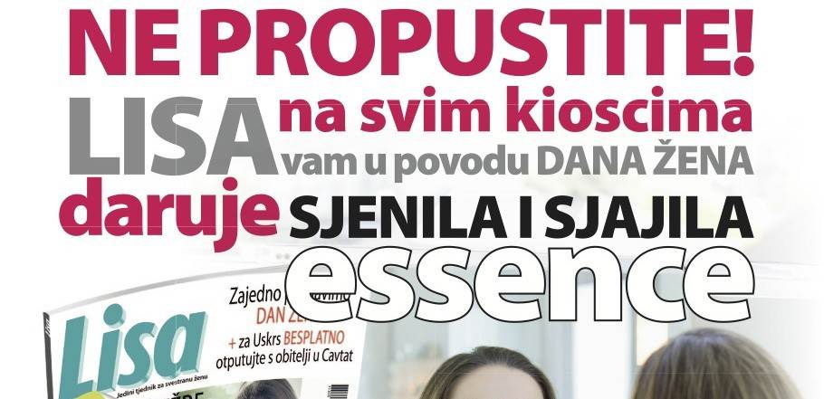 Bliži se Dan žena, a to je pravo vrijeme za iznenađenja. Rijetko koja žena može odoljeti beauty poslasticama koje nam serviraju mnogobrojne kozmetičke kuće. Glasno izrecite svoje želje i potrudite se da ih drugi čuju – i ostvare! Zato ne propustite novi broj ženskog tjednika Lisa koji ovaj tjedan daruje svoje čitateljice. Za samo 7,90 kn Lisa vam daruje sjenilo ili sjajilo essence, a ako se ne možete odlučiti što vam se više sviđa ili vam treba, počastite se i jednim i drugim. Potražite Lisu + dar na svim kioscima od 4. ožujka!