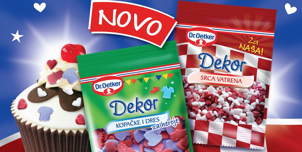 Probudite svoj vatreni duh uz prepoznatljive motive i boje Mini dekora te unesite atmosferu uzbudljivih sportskih natjecanja u vaš dom. Nogometna groznica osjeća se u svakom domu, a kako bi i vaše nepce bilo spremno za vatreno navijanje pripremite najkreativnije navijačke slastice koristeći vrhunsku kvalitetu i izvornu recepturu linije šećernih dekora Dr.Oetkera, koji dolaze u praktičnom pakiranju za jednokratnu upotrebu. Iznenadite svoje najmilije uz liniju asortimana Dr.Oetker Mješavina s kojima vrlo lako i praktično možete pripremiti muffine, pudinge i kolače koje ćete moći pretvoriti u prave navijačke rekvizite s Mini Dekorima te zajedno proslavite dobre rezultate u veseloj navijačkoj atmosferi. Preporučena MPC Mini dekora Srca Vatrena i Mini dekora Kopačke i dres iznosi 3,48Kn.