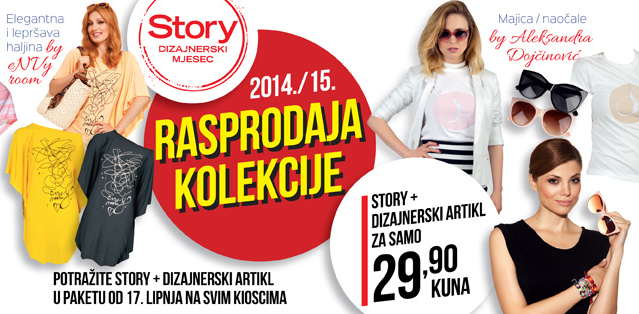Artikli nekih od najpoznatijih hrvatskih modnih imena, Aleksandre Dojčinović, dvojca ELFS te dvojca ENVY ROOM uskoro potražite uz Story, jer počinje Story dizajnerska rasprodaja. Story + jedan od dizajnerskih artikala potražite na kioscima od 17. lipnja po posebnoj ponudi od samo 29,90 kuna. Kako su ovo limited edition artikli, ovo je idealna prilika da sve modno osvještene čitateljice nađu svoj dizajnerski artikl po pristupačnoj cijeni samo uz Story. Požurite, jer količine su ograničene. To je ujedno i odlična najava ovogodišnjeg STORY DIZAJNERSKOG MJESECA, u kojem će i ove godine svoje kreacije za Story predstaviti najpoznatija dizajnerska imena Aleksandra Dojčinović, dvojac ELFS, dvojac ENVY ROOM te Juraj Zigman. Čitajte Story i uskoro ćemo vam otkriti ovogodišnje modne dizajnerske poslastice!