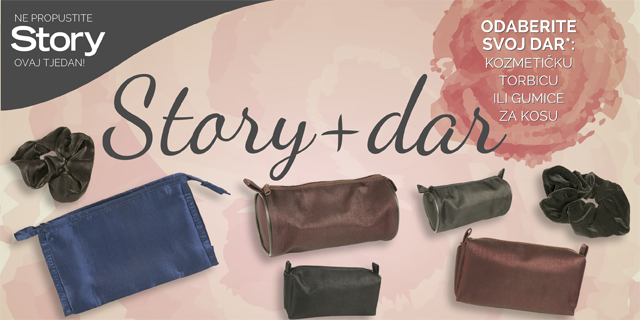 Samo u ovom broju Storyja donosimo dar svim čitateljima. Izaberite svoj dar između kozmetičke torbice ili dvije gumice za kosu. Kozmetičke torbice dolaze u više različitih veličina i boja: plavoj, crnoj, srebrnoj, bordo ili boji vanilije. Dvije gumice za kosu dolaze uz jedan časopis Storyja u crnoj boji – jedna gumica je baršunasta, a druga svilena. Ne propustite Story od 27. siječnja 2016.!