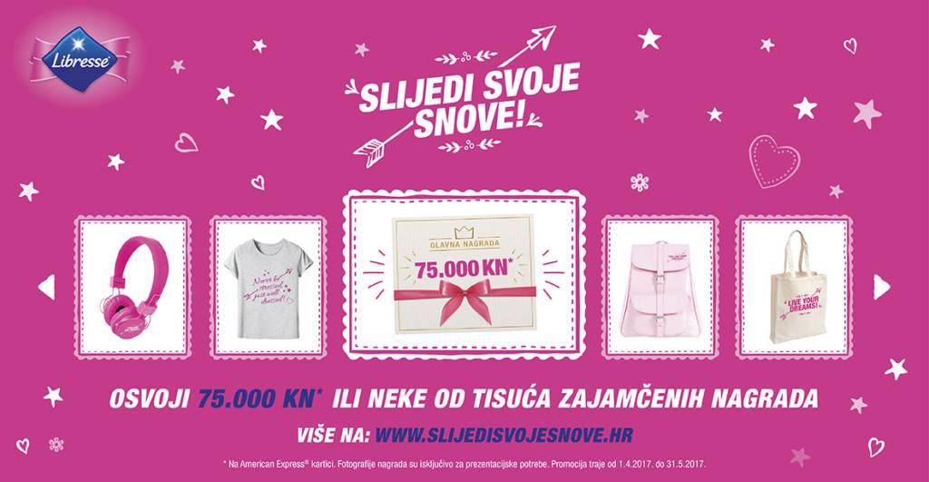 Uostalom, snovi služe tome da ih sanjamo i na kraju ostvarimo, a za to nema boljeg trenutka od sada. Sudjeluju u Libresse promociji i ostvari svoje snove. Osvoji 75.000 kuna na American Express® kartici ili neku od tisuća zajamčenih nagrada! Kupi bilo koji Libresse promotivni proizvod, pronađi jedinstveni kod na naljepnici, sakupljaj bodove i izaberi svoju omiljenu nagradu! Možeš izabrati između čak 5700 zajamčenih nagrada! Svaki uneseni jedinstveni kod (uključujući kodove koji su korišteni za zajamčene nagrade) može osvojiti glavnu nagradu od 75.000 kuna na American Express® kartici putem izvlačenja na kraju promocije. Nagradna igra traje od 1.4. do 31.5.2017., a što više kodova pošalješ, veće su šanse da osvojiš glavnu nagradu! Pravila i sve detalje vezane za promociju potraži na www.slijedisvojesnove.hr Sanjaj i dalje!