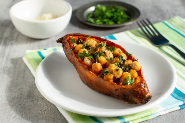 Batat je poput krumpira, čest prilog nekim mesnim jelima, a može se pripremati na puno načina. Pronašli smo recept za zapečeni punjeni batat s slanutkom i keljem u kremastom umaku od jogurta i currya. Probajte ovaj brz i jednostavan recept koji možete servirati kao zasebno jelo ili kao prilog glavnom.
