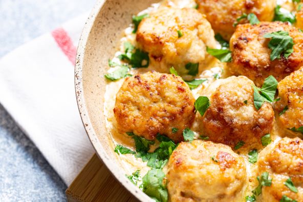 Ovi zalogaji od mljevene piletine ili puretine odlično pašu uz špagete i umak od rajčice, a možete ih poslužiti i uz pire krumpir ili uz pečeno povrće.
