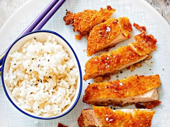 Panko su japanske krušne mrvice koje su svjetlije i krupnije te su tajna savršeno hrskavog i sočnog komada mesa. Poslužite ga u posudi sa sushi rižom, svježim kupusom, mladim lukom i voćem, poput manga i šipka.