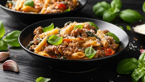 Zagrijte tavu, dodajte ulje i dodajte mljeveno meso, te ga začinite. Nakon što se meso poprži dodajte luk, a potom i papriku. Stavite kuhati tjesteninu, a sito nasjeckanog režnje češnjaka ubacite u tavu, pa dodajte paste od rajčice te povrtnog temeljca. Dodajte zatim vrhnje i ostavite da se sve prokrčka i ispari 10 minuta, stavite svježeg špinata i ribanog sira. Na kraju ubacite skuhanu tjesteninu. Promiješajte i sprem no je za serviranje.