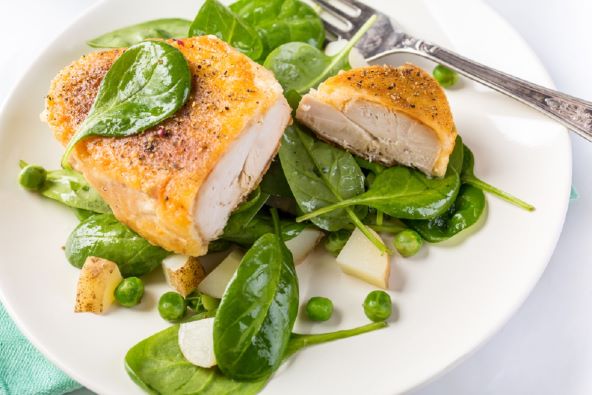 Umočite piletinu u bjelanjke, pa uvaljajte na tanjur s malo soli i papra. Pecite piletinu 10-12 minuta, dok ne porumeni i postane hrskava.