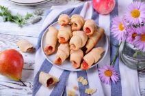 Zatim ga premjestite na pobrašnjenu podlogu, prerežite na pola i jednu polovinu kugle razvaljajte valjkom za tijesto u krug. Izrežite na trokute, punite po želji te zamotajte u rolice.