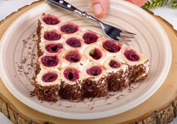 Na pladanj po dužini nanesite malo kreme, na nju složite 4 rolice s višnjama te ih premažite kremom. Na sloj kreme složite sljedeće 3 rolice, premažite kremom, potom 2 rolice, nanesite kremu i na kraju stavite zadnju rolicu i premažite kremom. Ostatkom kreme zagladite bočne stranice. Dobit ćete duguljasti kolač piramidalnog oblika.