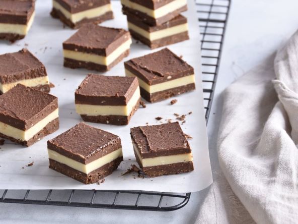 Četvrtasti kalup, poput onog za brownies, obložite papirom za pečenje. Prebacite smjesu žlicom i zagladite je, a potom je prelijte otopljenom čokoladom. Stavite u hladnjak na barem sat vremena prije rezanja i posluživanja.