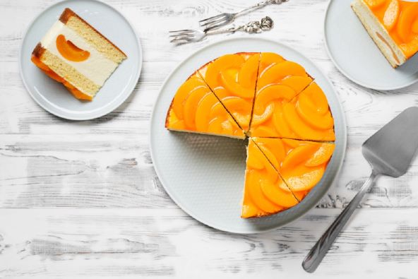 Za podlogu, pomiješajte mrvljene kekse i maslac u multipraktik dok ne nalikuju finim krušnim mrvicama, zatim ravnomjerno posipajte po kalupu za tortu. Nježno pritiskajući, na to stavite kremu od breskve i ohladite preko noći ili dok se ne stegne.
