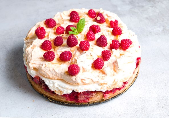 Postavite donji sloj torte na pladanj za torte od bjelanjaka stranom prema gore i prekrijte ga sa svim šlagom od malina, ravnomjerno ga rasporedite po površini. Stavite sljedeći sloj na vrh, bjelanjke stranom prema gore. Po vrhu lagano pospite šećerom u prahu i po vrhu posložite maline koje ste sačuvali.