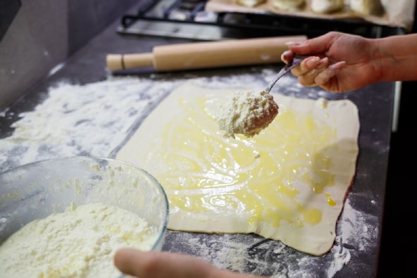 Razvaljajte tijesto na debljinu 2-3 cm. Premažite maslacem i razmažite punjenje po cijelom tijestu. Režite na male komade i napravite razdjeljak drvenom kuhačom.