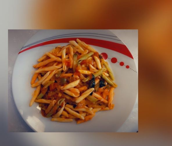 Dodati luk, isjeckane rajčice, jednu isjeckanu papriku i jednu isjeckanu tikvicu.