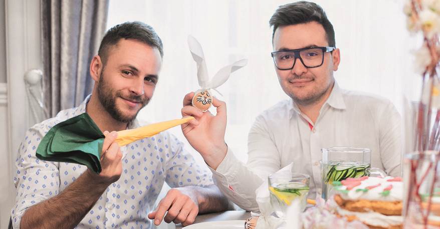 Aleksandar Šekuljica i Ivan Tandarić poznatiji kao modni dvojac ELFS vole sve što ima veze s Uskrsom, a za StoryGourmet su pokazali kako se od stvari koje imamo u kući mogu izraditi ukrasi i pisanice koji će razveseliti obitelj i prijatelje. Bogat uskrsni stol neizbježan je dio ovog, Elfsima omiljenog, blagdana a kako ističu, stol i ukrasi trebaju biti u živim bojama, u skladu s proljećem. Evo njihovog prijedloga za originalne pisanice! MATERIJAL I POSTUPAK žute salvete bijele salvete zelene salvete škare crni marker korektor bijela trakica jaja pribor za jelo