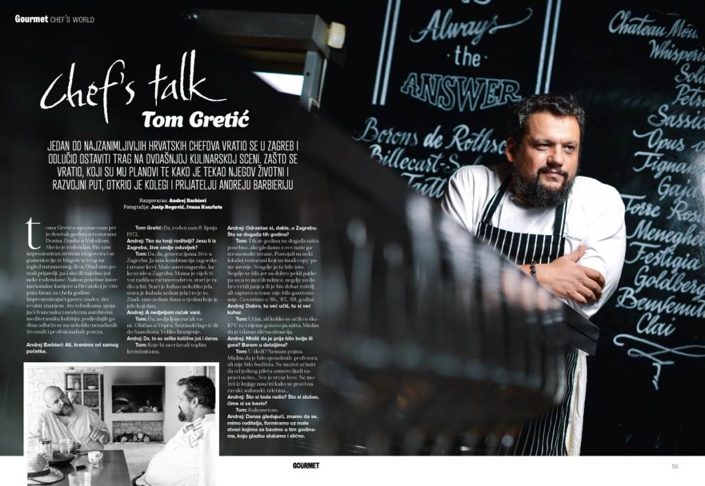 "Toma Gretića upoznao sam prije desetak godina u restoranu Denisa Zembe u Voloskom. Slavio je rođendan. Bio sam impresioniran širinim razgovora i argumentacije te blagošću ovog naizgled natmurenog diva. Otad smo postali prijatelji, pa i slavili zajedno još neke rođendane. Nakon posebne internacionalne karijere u Hrvatskoj je više puta biran za chefa godine. Impresionirajući gastro znalce što svojim znanjem, što tehnikama, spajajući francusku i modernu autohnonu mediteransku kuhinju, posljednjih godina odlučio se na nekoliko nenadanih životnih i profesionalnih poteza." Tako je svoj intervju s kolegom i prijateljem Tomom Gretićem započeo Andrej Barbieri. A što su razgovarali idućih nekoliko sati, otkrijte u novom broju magazina StoryGourmet koji je u prodaji od 27. rujna.