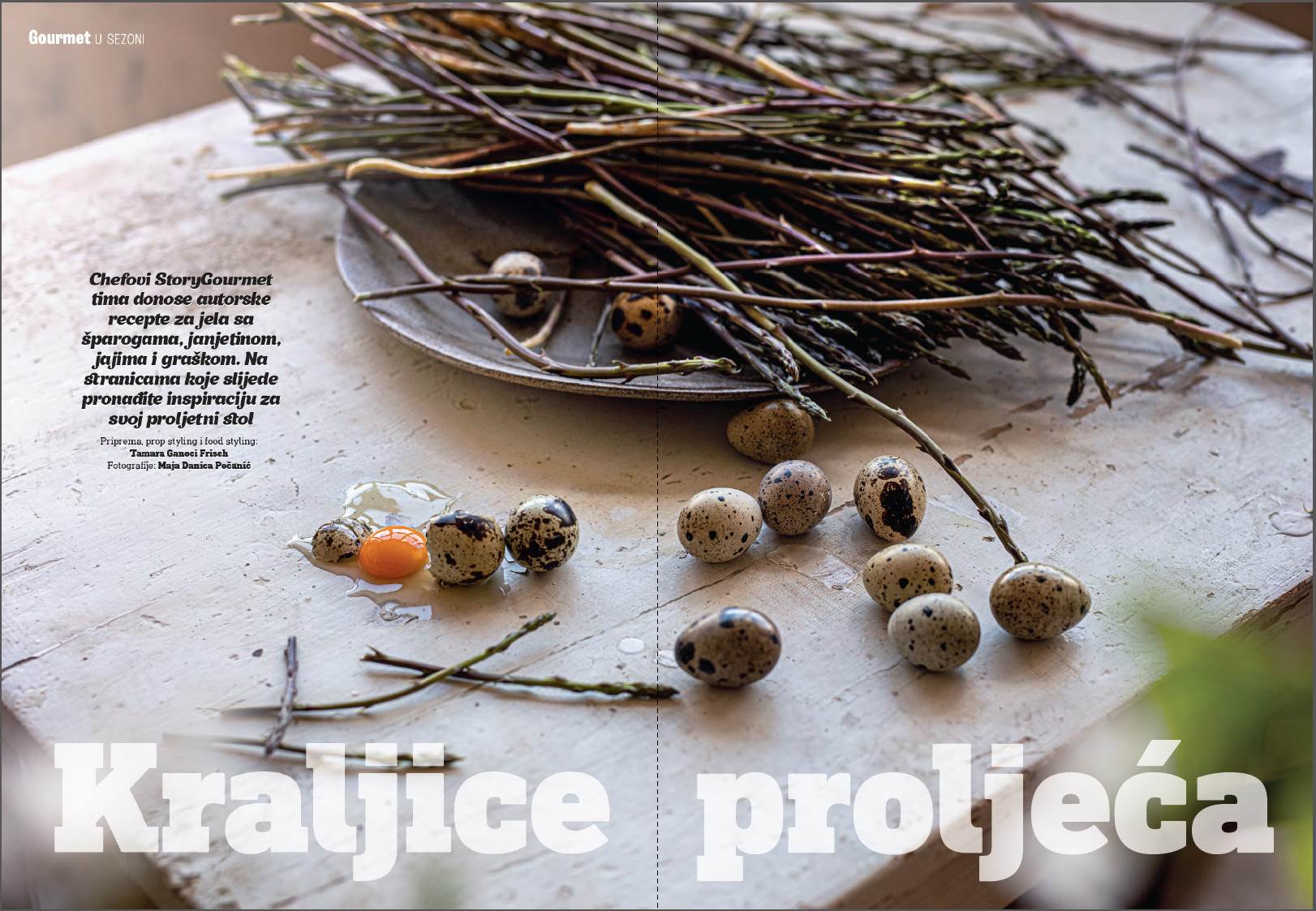 Uživajte u raskošnom editorijalu koji oživljava novo buđenje i snagu svježih namirica spravljenih po receptima chefova StoryGourmet tima. Odvažite se iskušati jedan od recepata koji slijede Na odabir su vam: Kultivirane zelene šparoge s otvorenog žara, konfitirani žumanjci u svinjskoj masti, prah od pršuta ili Velute od mladog graška, šlag od mente, sušene cherry rajčice, te Janjeći tingul i domaći široki rezanci chefa Ante Udovičića. Zatim Juha od stabljika šparoga i riže ili Pohani janjeći kotlet s dipom od graška i kumina, potom Salata od šparoga, pohani žumanjci I tartufi, te Kuhane šparoge s emulzijom od limuna, ulja i soli chefa Gregorija Mannuccija, Najdraži jednostavni zalogaj chefa Ivana Pažanina, njegova Domaća tjestenina s kozicama i šparogama ili Janjetina s bižima