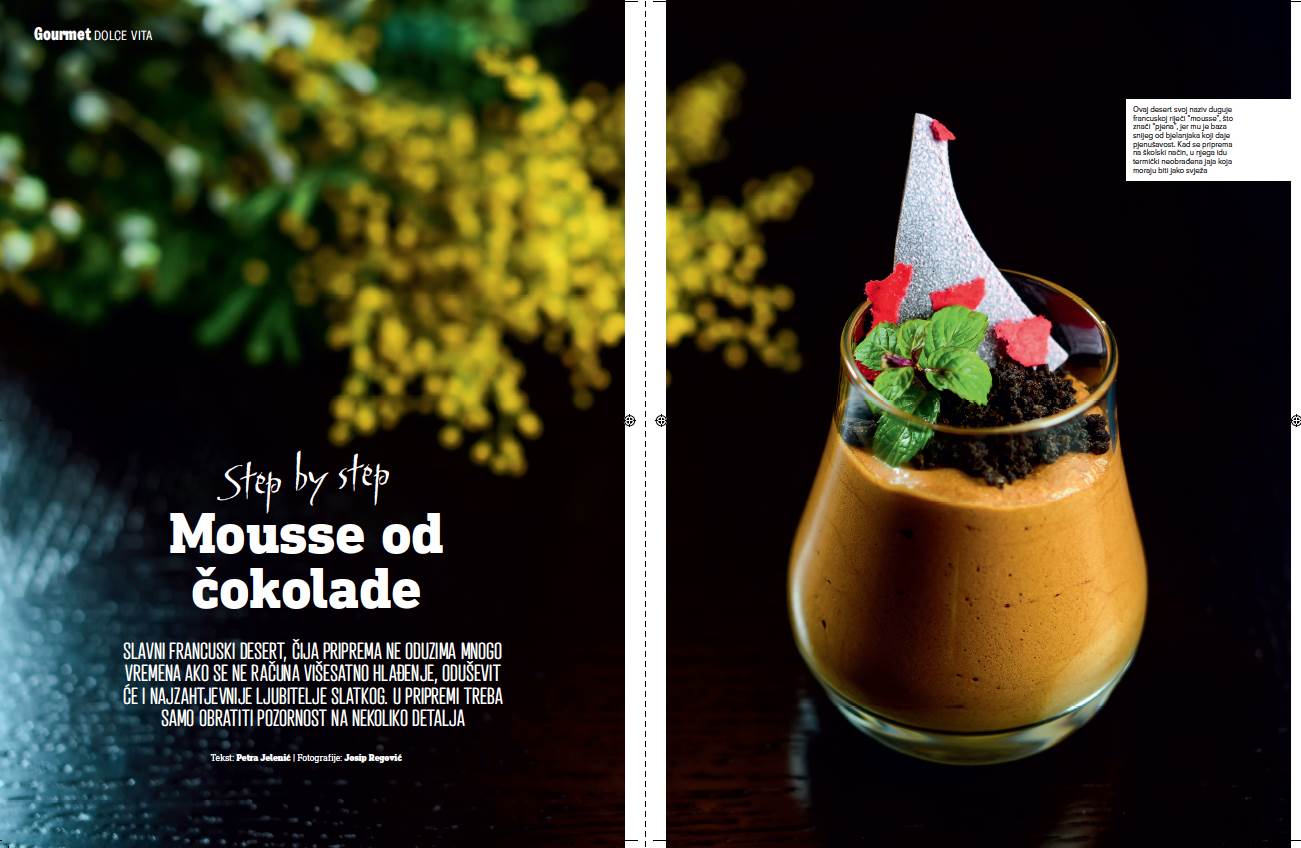 Slavni francuski desert, čija priprema ne oduzima mnogo vremenna ako se ne računa višesatno hlađenje, oduševit će i najzahtjevnije ljubitelje slatkog. Ovaj desert duguje francuskoj riječi "mousse" što znači "pjena" jer mi je baza snijeg od bjelanjaka koji daje pjenušavost. U pripremi treba samo pripaziti na nekoliko detalja, upozorava naša ponajbolja slastičarka Petra Jelenić.