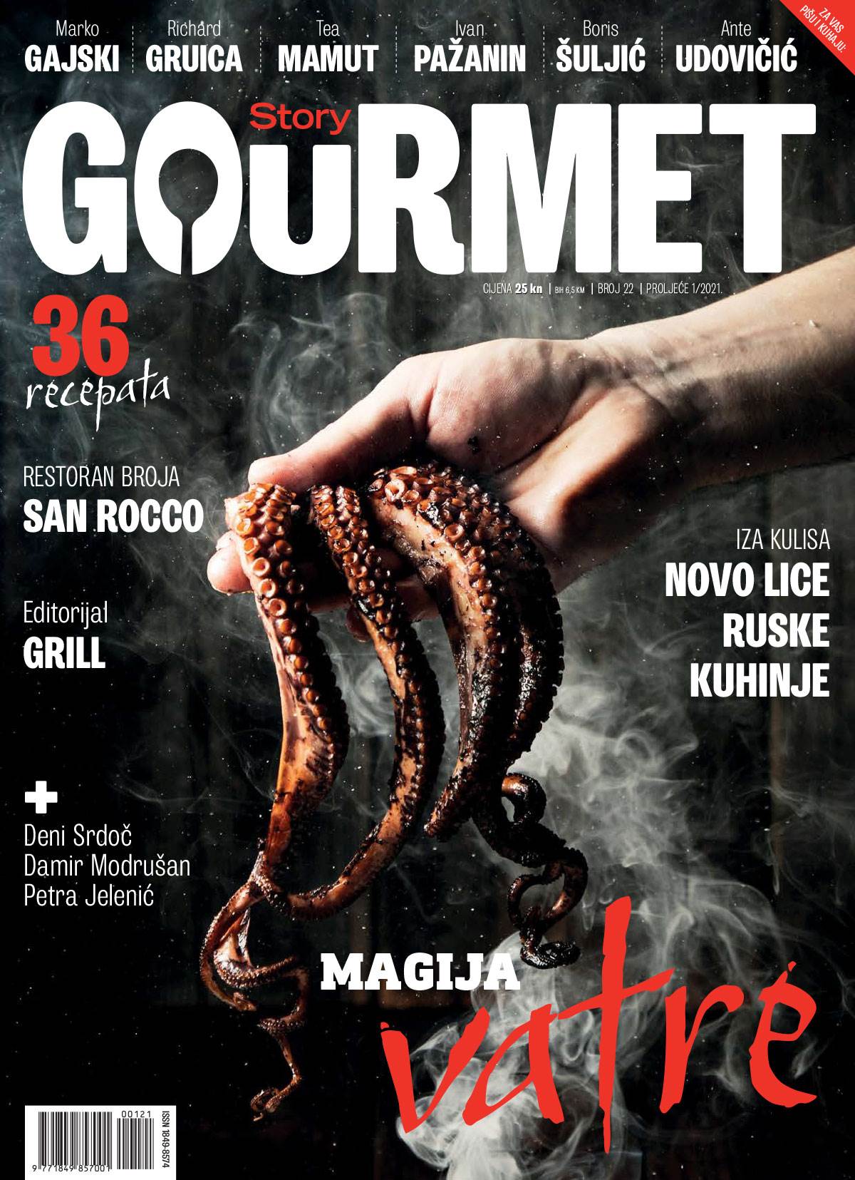 Puni ideja za novi, proljetni broj bili su naši chefovi, članovi stručnog tima StoryGourmeta - Marko Gajski, Richard Gruica, Tea Mamut, Ivan Pažanin, Ante Udovičić i drugi suradnici. Kako dolaskom proljeća sve više boravimo na otvorenom (a to je i u skladu s protuepidemijskim mjerama), za temu broja odabrali smo grill, roštilj, gradele... Chefovi su sami birali namirnice za editorijal i, zanimljivo, svaki od njih otišao je u svom smjeru.