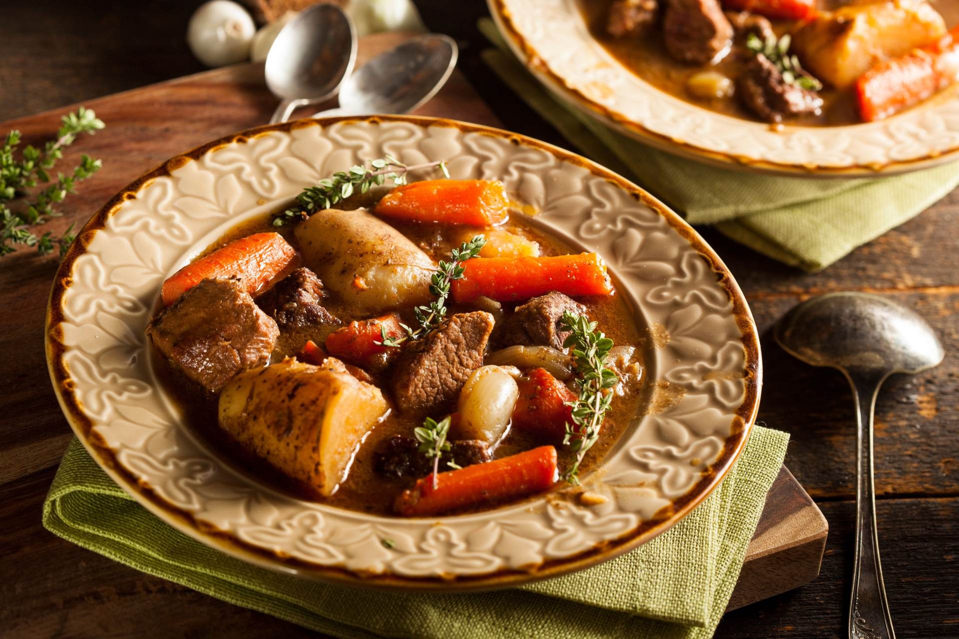 Vratite meso u lonac, dodajte temeljac i pustite da krčka. Ubacite grančicu timijana i posložite krumpir (ne mora biti potpuno uronjen u tekućinu). Začinite krumpir, poklopite lonac i prebacite ga u pećnicu.