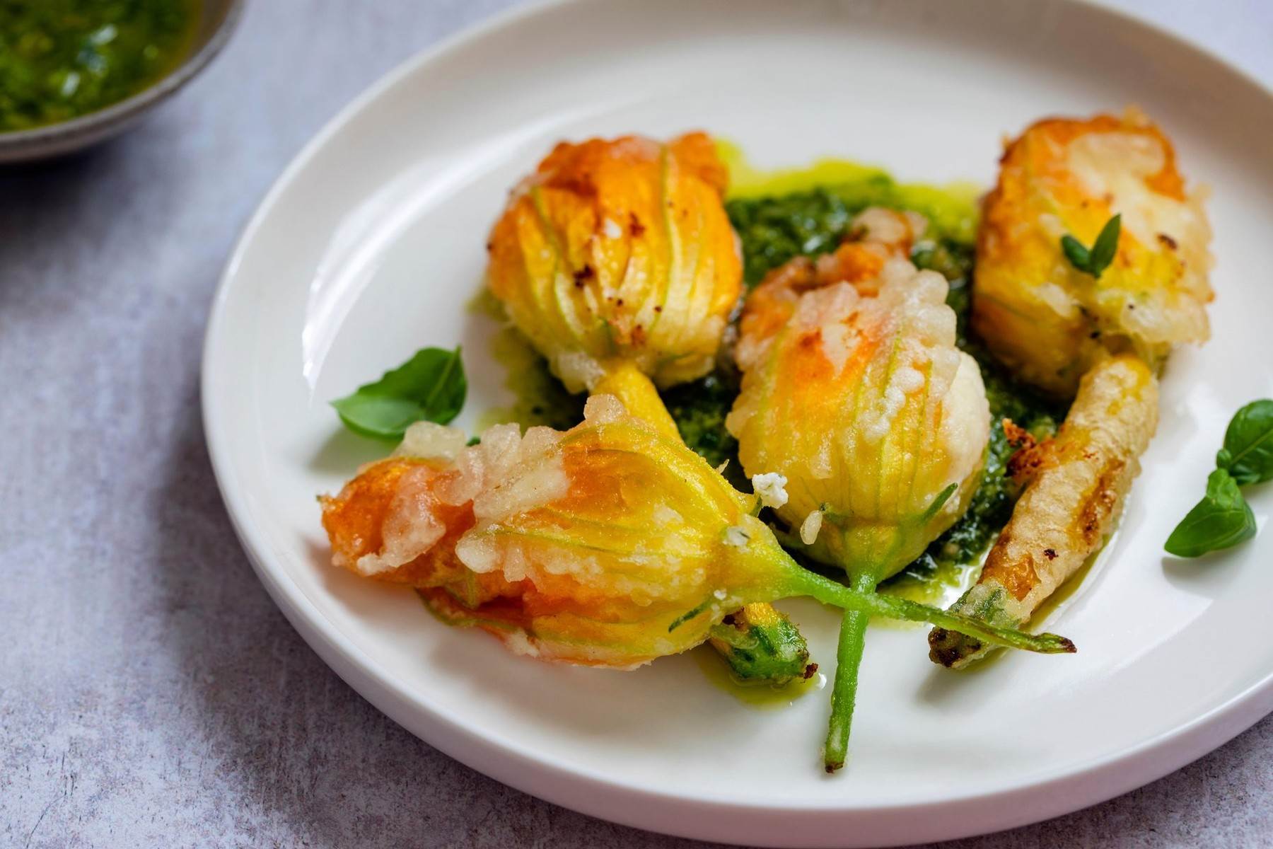 Izmiješajte ricottu, parmezan i po želji nasjeckani bosiljak te smjesom napunite cvjetove koje ste oprali, odstranili im tučak i prašnike te osušili. Punite ih pripremljenom smjesom te im zavrnite vrhove latica kako smjesa ne bi iscurila. Cvjetove umočite u tempuru (tekuće tijesto) i pržite na jako ugrijanom ulju do dvije minute. Ostavite na kuhinjskom papiru kako bi se odstranio višak masnoće i poslužite tople.