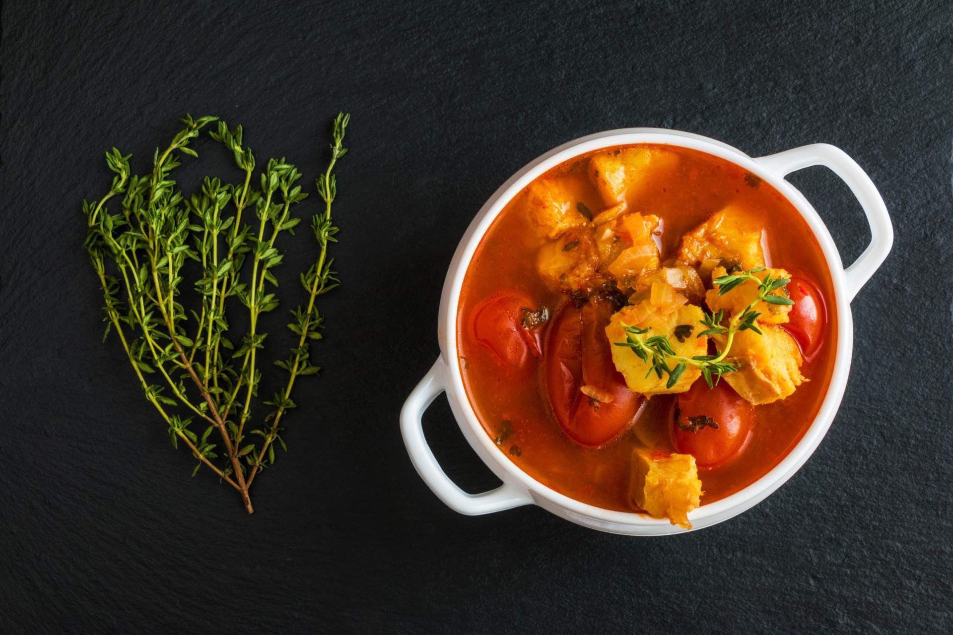 Zagrijte maslinovo ulje u dubokom loncu. Dodajte nasjeckani luk i pirjajte pet minuta. Dodajte nasjeckani češnjak i peršin te pirjajte još nekoliko minuta. Dodajte rajčicu i koncentrat rajčice te kuhajte na laganoj temperaturi desetak minuta. Dodajte riblji temeljac, bijelo vino, timijan te posolite i popaprite po ukusu. Dodajte filete ribe i pustite da se sve zajedno krčka na laganoj vatri sve dok riba nije kuhana. Poslužite uz prepečeni kruh.