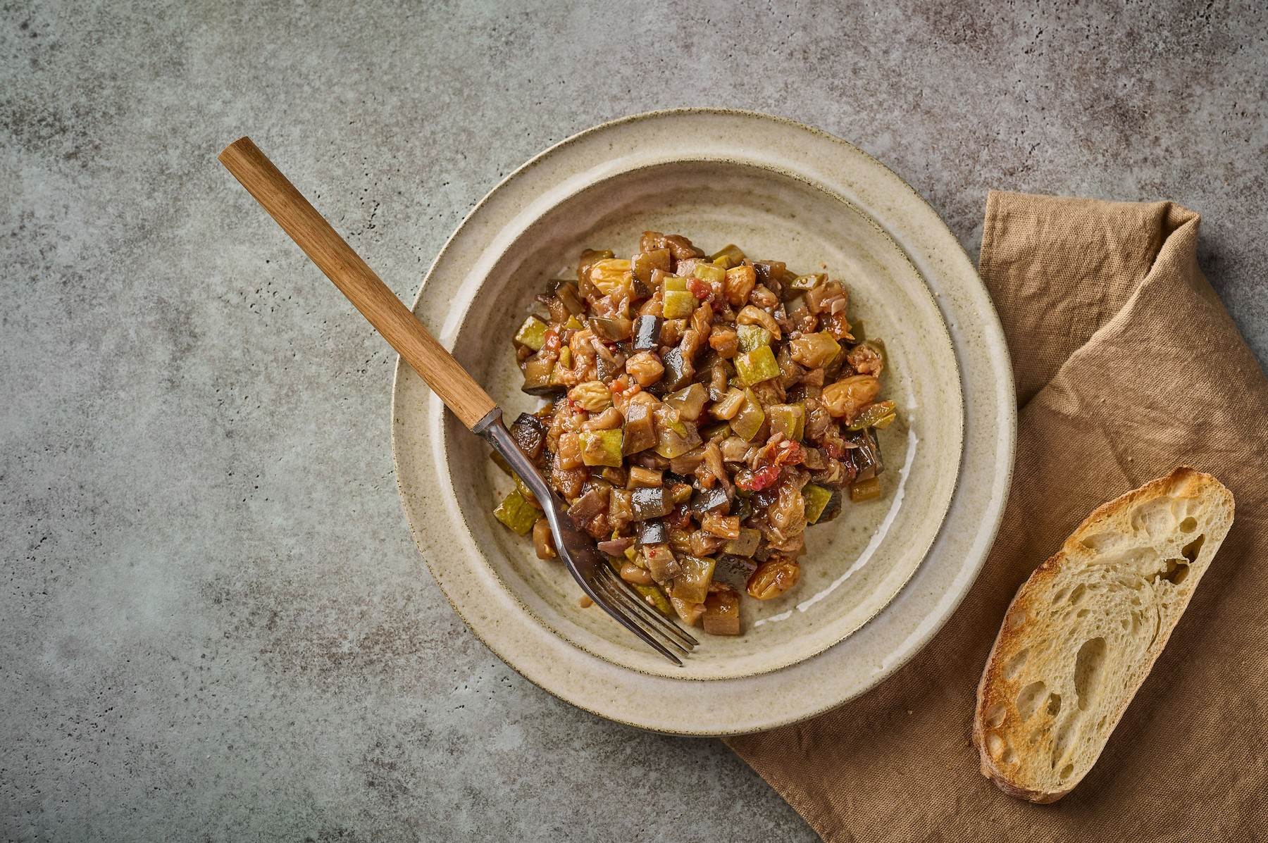 Ukoliko ste ljubitelj talijanske kuhinje, patlidžana i rajčica te ne izbjegavate kruh - započnite s pripremom ovog recepta. Jer spoj sočne caponate, sicilijanske delicije i mekane ciabatte je neodoljiv. Caponata, jelo u kojem se spaja i prožima najbolje od ljetnih patlidžana, rajčica, celera, maslina, luka, bosiljaka i kapara uz nezabilazni dodatak vinskog octa (domaćeg ako je ikako moguće), uglavnom se poslužuje uz tjesteninu, rižu, palentu, ali i uz ribu, meso, pečenu piletinu, dok ovaj put sve te okuse spajamo s kriškama rustikalnog kruha. Kao stvoreno za izdašni, ukusni i hranjivi obrok usred tjedna ali i za druženja pod ljetnim noćnim nebom.