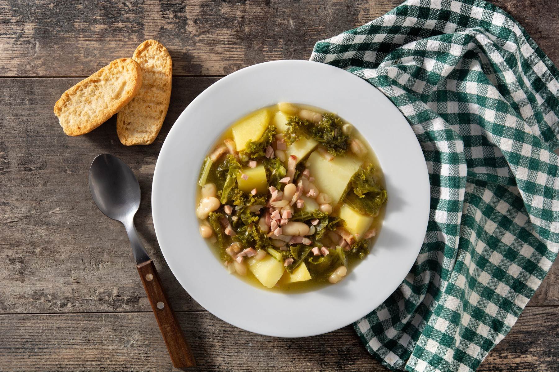 Priprema: operite, očistite i sitno nasjeckajte luk, mrkvu i celer. Grah procijedite, operite, polovicu usitinite, ostatak ostavite u zrnu. Kelj operite, narežite na trake. Ogulite krumpir, narežite ga na kackice. Pelate nasjeckajte na sitne komadiće. U većoj posudi zagrijte maslinovo ulje, te na laganoj vatri pirjajte luk, mrkvu, celer dok ne omekšaju. Dodajte sol, papar i začine te pelate. Kad prokuha dodajte grah, u zrnu i usitnjeni, te krumpir. Podlijte s 0,75 l vode te kada zakipi dodajte kelj. Polupokriveno na laganoj vatri kuhajte oko 45 minuta kako bi sve povrće omekanilo i dalo kremastu teksturu. Poslužite uz prepečene kriške kruha i to tako da kruh stavite u tanjur te preko kruha dodate juhu. Dobar tek.