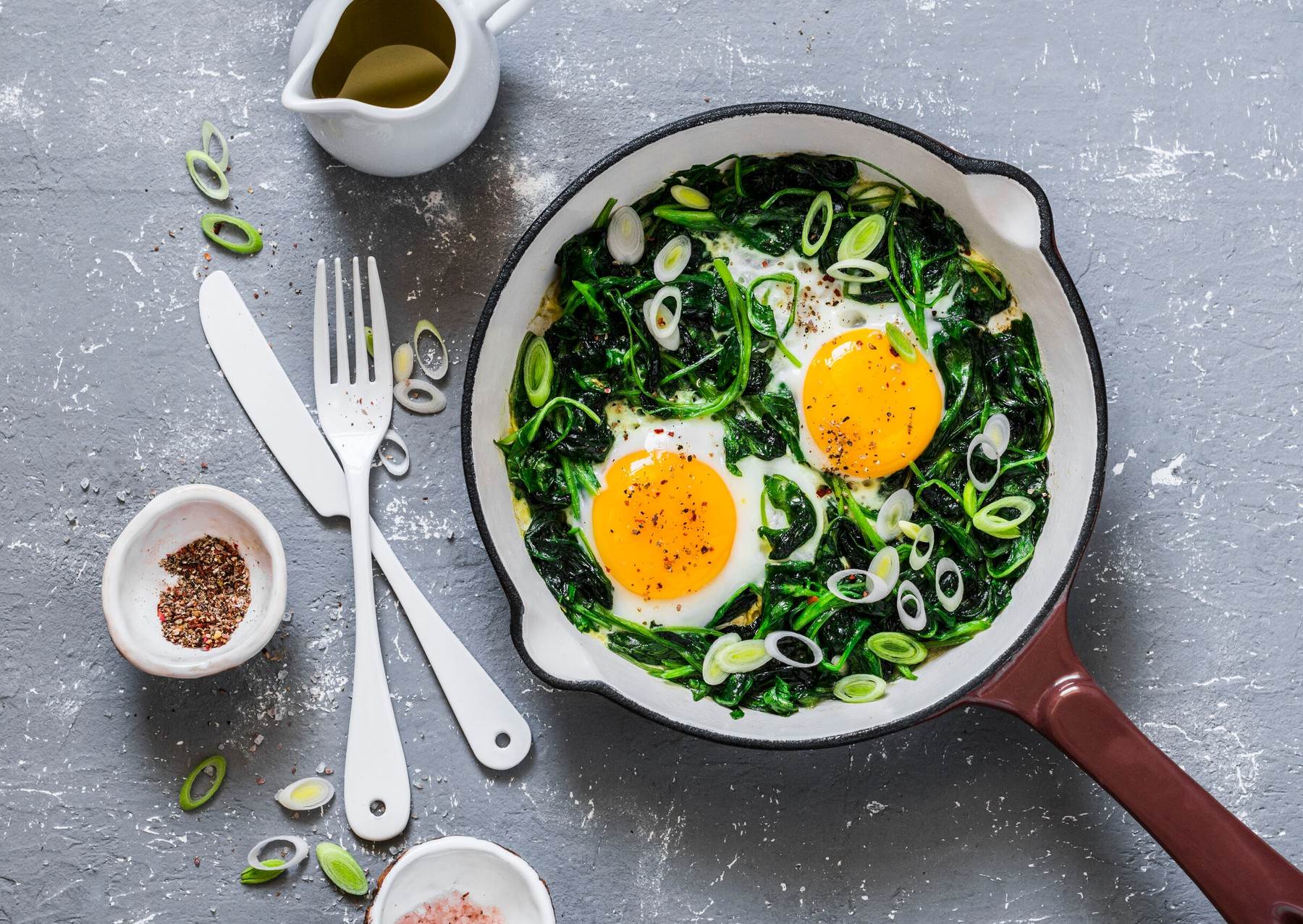 Hladniji i kraći dani često u nama bude osjećaj umora te želju za hranom koja će nam pružiti kvalitetnu energiju. A što može biti korisnije od ukusnog i hranjivog doručka? Zato predlažemo jelo koje se lako priprema a koje će vas zahvaljujući hranjivoj i zasitnoj kombinaciji održati sitima i sretnima dobar dio dana. A tajna se krije u kombinaciji špinata, pripremljenog na lešo, i jaja na oko, a sve začinjeno maslinovim uljem i vama dragim začinima. Jer jaja su namirnica iznimne biološke vrijednosti i hranjivosti, s visokim sadržajem bjelančevina i kolina, što ih unutar piramide prehrane svrstava u istu kategoriju kao i meso. Špinat je povrće bogato klorofilom, proteinima, mineralima željezom, magnezijem, fosforom te brojnim oligoelementima potrebnima za održavanje ravnoteže zdravlja, te je posebno vrijedan jer ima značajne zalihe hranjivih tvari u odnosu na svoju kaloričnu vrijednost. A u kombinaciji ne samo što će vas nahaniti već će i razgaliti vaše okusne pupoljke jer savršeno se slažu i po okusu. Dobar tek!