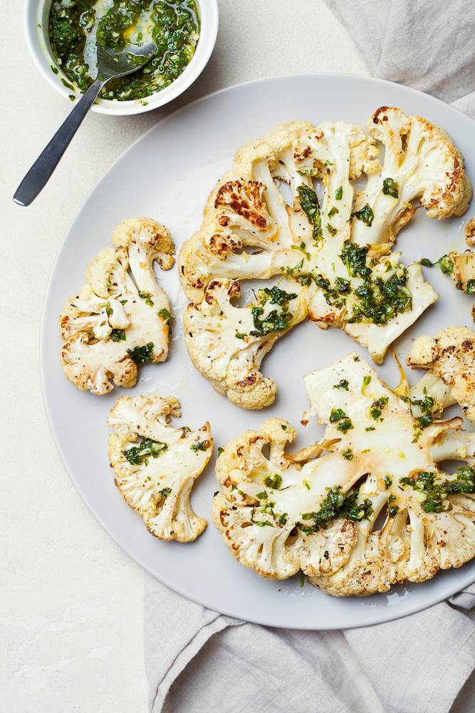 U potrazi za odličnim plant-based jelima uvijek se rado vratimo cvjetači. Odličan izvor vitamina C, bogata nutrijentima cvjetača je niskokalorična namirnica, u 100 g sadrži svega 25 kalorija te je više nego odličan odabir za pripremu zdravog niskokaloričnog obroka punog vitamina i minerala. Cvjetača se priprema kuhana na salate, kao podloga za zdrave pize i pizze, a odličan je pripremljena kao odrezak. Donosimo više ideja za pripremu, a za svaki od recepata je važno očišćenu i opranu cvjetaču narezati na kriške debljine oko 2,5 cm. Narezane kriške pecite u pećnici ili na tavi te pečenu poslužite začinjenu s malo soli i svježe mljevenog papra te domaćim umacima! Pečena cvjetača otvara paletu okusa koja pruža novu okusnu dimenziju ovom povrću što je odlična baza za sljubljivanje s umacima kao što su vierge, chimichuri ili pesto.