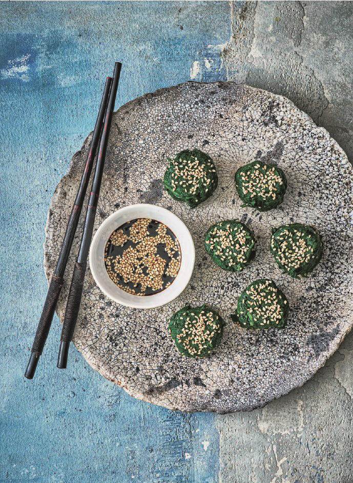 Špinat kuhajte poklopljen na srednje jakoj vatri dok ne povene. Ocijedite i ostavite da se potpuno ohladi. Istisnite preostalu tekućinu iz ohlađenog špinata. Koristeći podlogu za sushi ili dva sloja aluminijske folije veličine kvadrata otprilike 30 cm, stavite polovicu špinata pri dnu podloge i čvrsto pritisnite, zatim uvijte podlogu ili foliju usko oko špinata kao cijev i napravite oblik tvrde kobasice. Odmotajte, uvijte u prozirnu foliju. Ponovite postupak i s drugom polovicom špinata. Hladite 30 minuta ili dulje. Kada se ohladi, odmotajte pa vrlo oštrim nožem narežite svaku rolu na pet do šest kriški, svaka dužine 3 cm, i položite ih uspravno na pladanj ili na zasebne tanjure. Za umak zagrijte malu tavu za prženje bez ulja na srednje jakoj vatri pa dodajte sezamove sjemenke. Tostirajte ih često miješajući dok ne postanu zlatne i počnu pucati. Maknite ih iz tave na tanjur da se ohlade. Ostavite žlicu sezamovih sjemenki za posuti špinat. Pomiješajte preostale sezamove sjemenke s ostalim sastojcima te stavite u zdjelu za umake ili u četiri zasebne zdjelice za umake. Pospite preostale sezamove sjemenke po rolicama od špinata te ih poslužite s umakom.