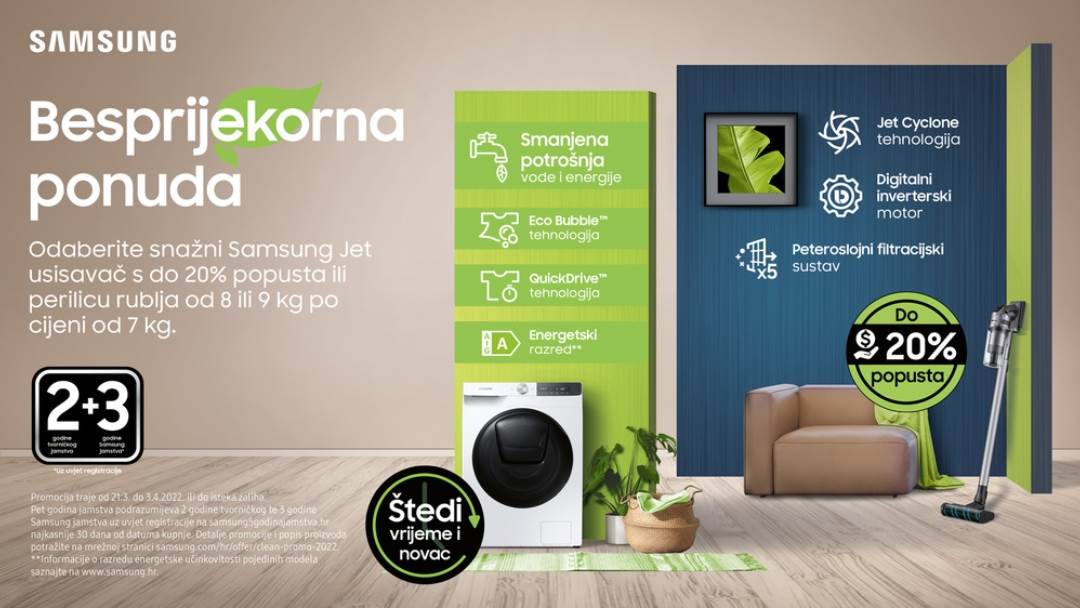 Uz Samsung kućanske uređaje, vaš će dom zasjati u proljeće, a sada možete iskoristiti i do 20% popusta kupnjom Samsung Jet usisavača ili perilice rublja od 8 ili 9 kilograma koju možete odabrati po cijeni od 7 kilograma. Promotivna akcije traje od 21. ožujka do 3. travnja 2022. ili do isteka zaliha, a za više informacija posjetite https://www.samsung.com/hr/offer/clean-promo-2022/.