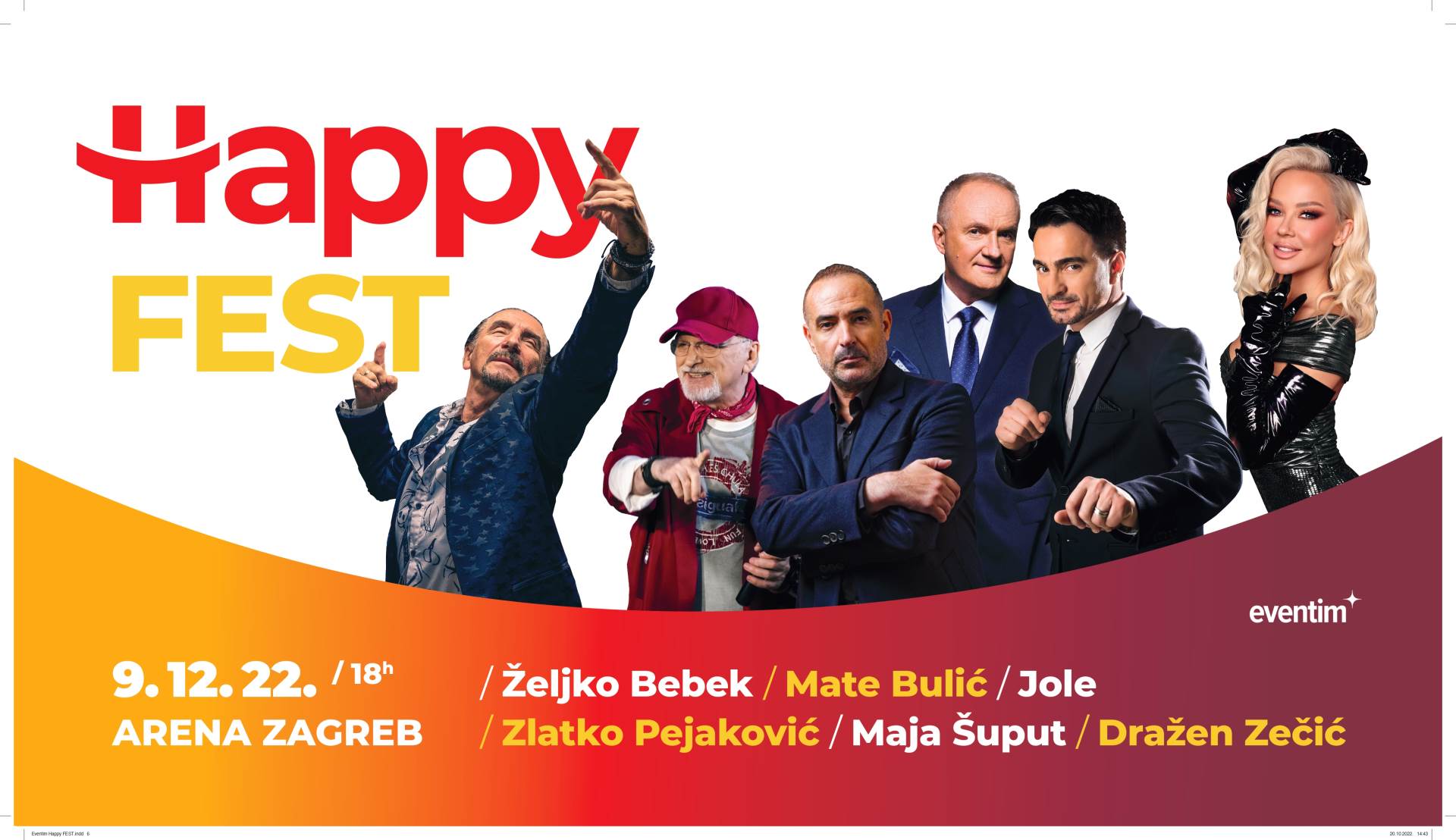 Prvi put u povijesti najveća imena domaće zabavne glazbe udružit će snage i nastupiti u najvećoj hrvatskoj dvorani, a Arena Zagreb te će večeri, 9. prosinca postati najveći klub u Europi. Očekuj neočekivano na Happy festu, glazbenom spektaklu koji diže na noge i dira u srce i dušu!