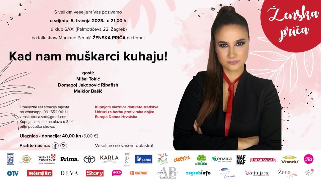 Novo izdanje Ženske priče održat će se u klubu hrvatskih glazbenika SAX! (Palmotićeva 22, Zagreb), u srijedu 05.travnja 2023., u 21,00 h, a sav prihod od ulaznica donirat će se udruzi protiv raka dojke Europa Donna Hrvatska. Obavezna je rezervacija mjesta za posjetitelje na WhatsApp 091 552 06 11 ili na zenskaprica.sax@gmail.com