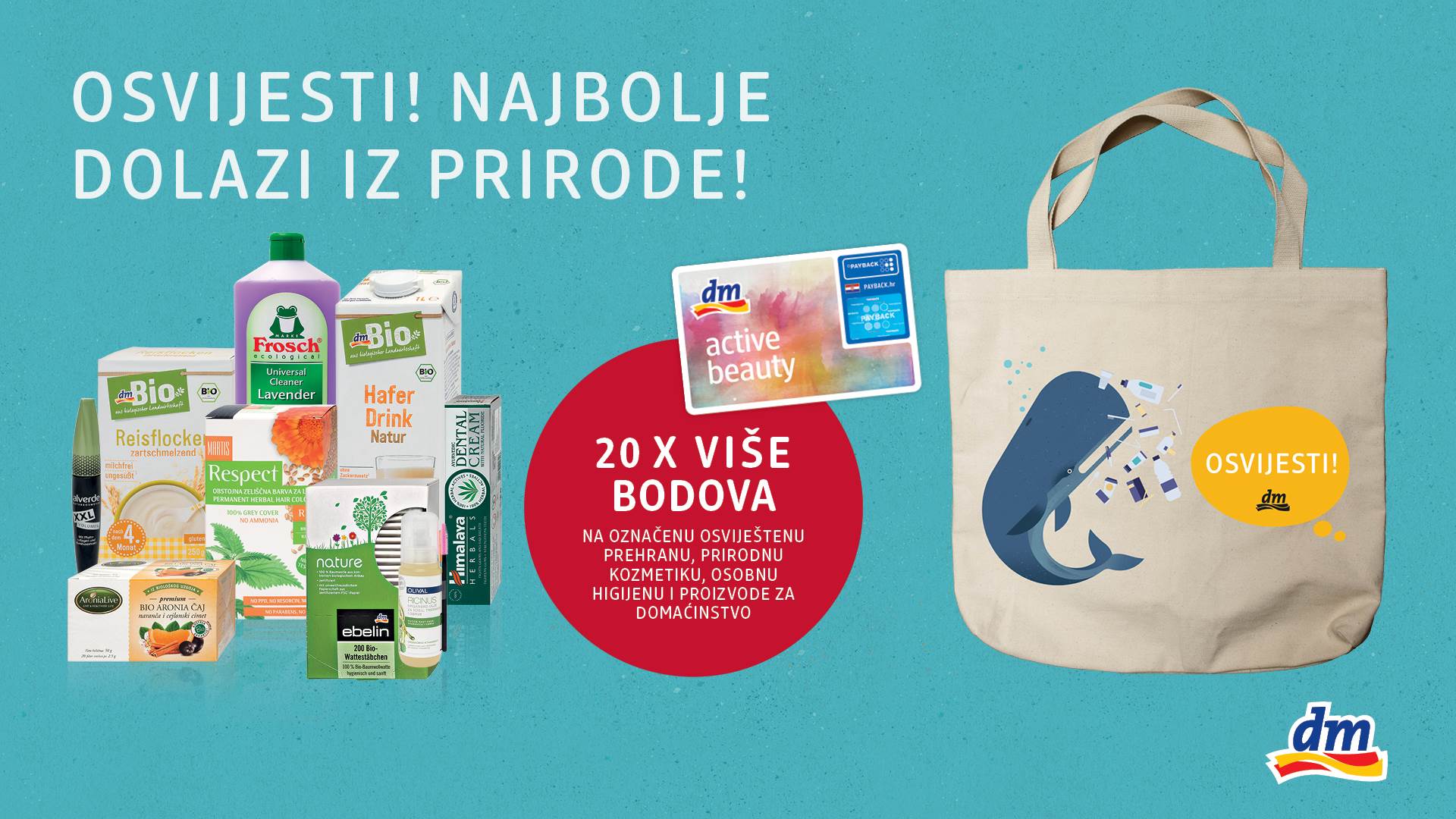 Ove veljače u dm-u vas očekuju proizvodi koji sadrže ono najbolje iz prirode i koji su odraz održivog življenja i brige za okoliš. Za svaku kupnju označenih proizvoda prirodne kozmetike, osviještene prehrane, proizvoda za higijenu i kućanstvo te eko proizvoda za bebe zaradit ćete 20 puta više bodova na dm active beauty kartici, a potrošite li na označene proizvode 150 kuna ili više, u dm-u će vas nagraditi i trajnom torbom za kupovinu.