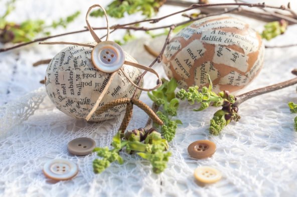 5. korak Kada se trakice osuše, izrežite uže na otprilike 25 cm dužine i obujmite jaje s njim i zavežite mašnicu. Na nju nanesite malo ljepila i zalijepite gumb.